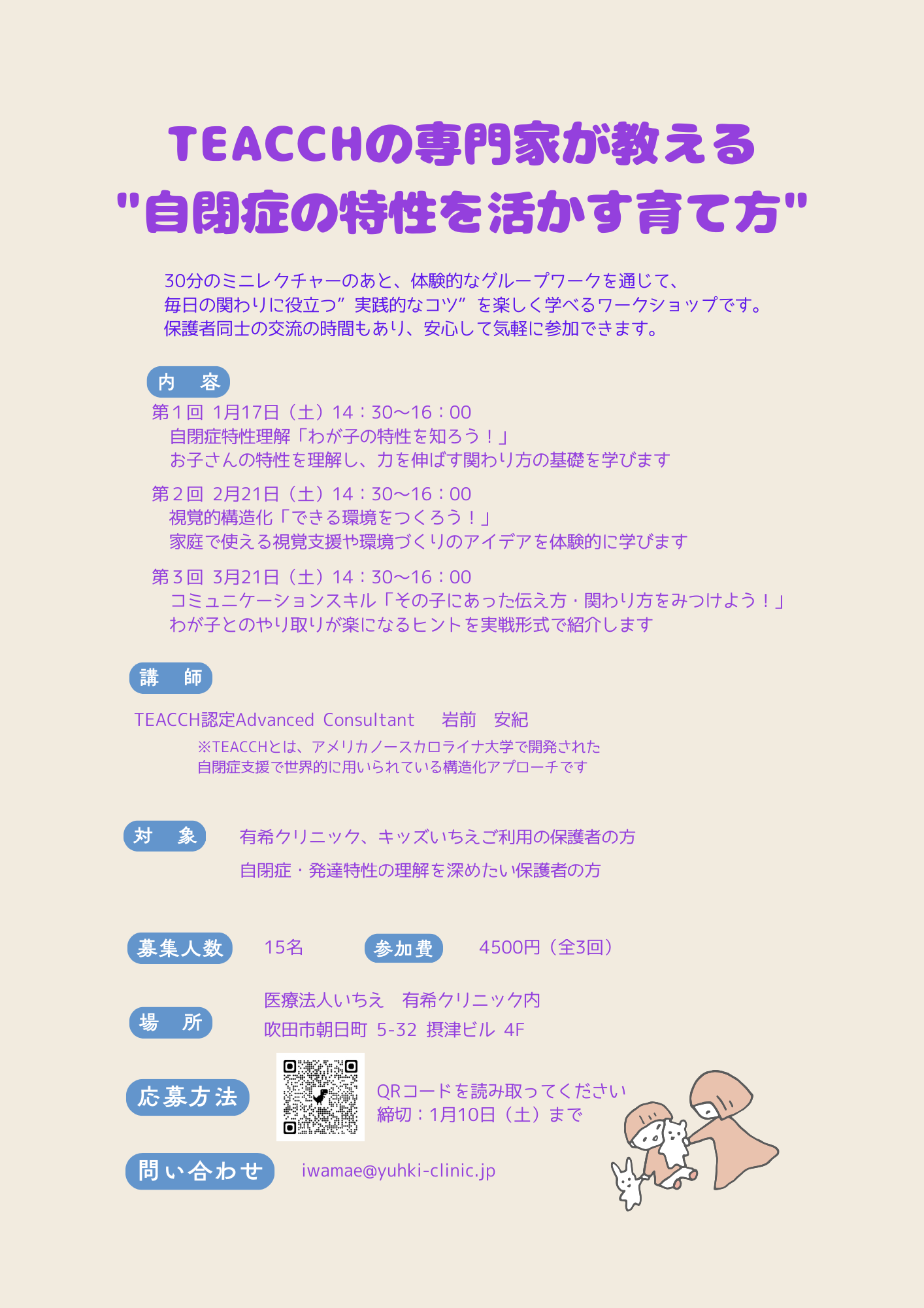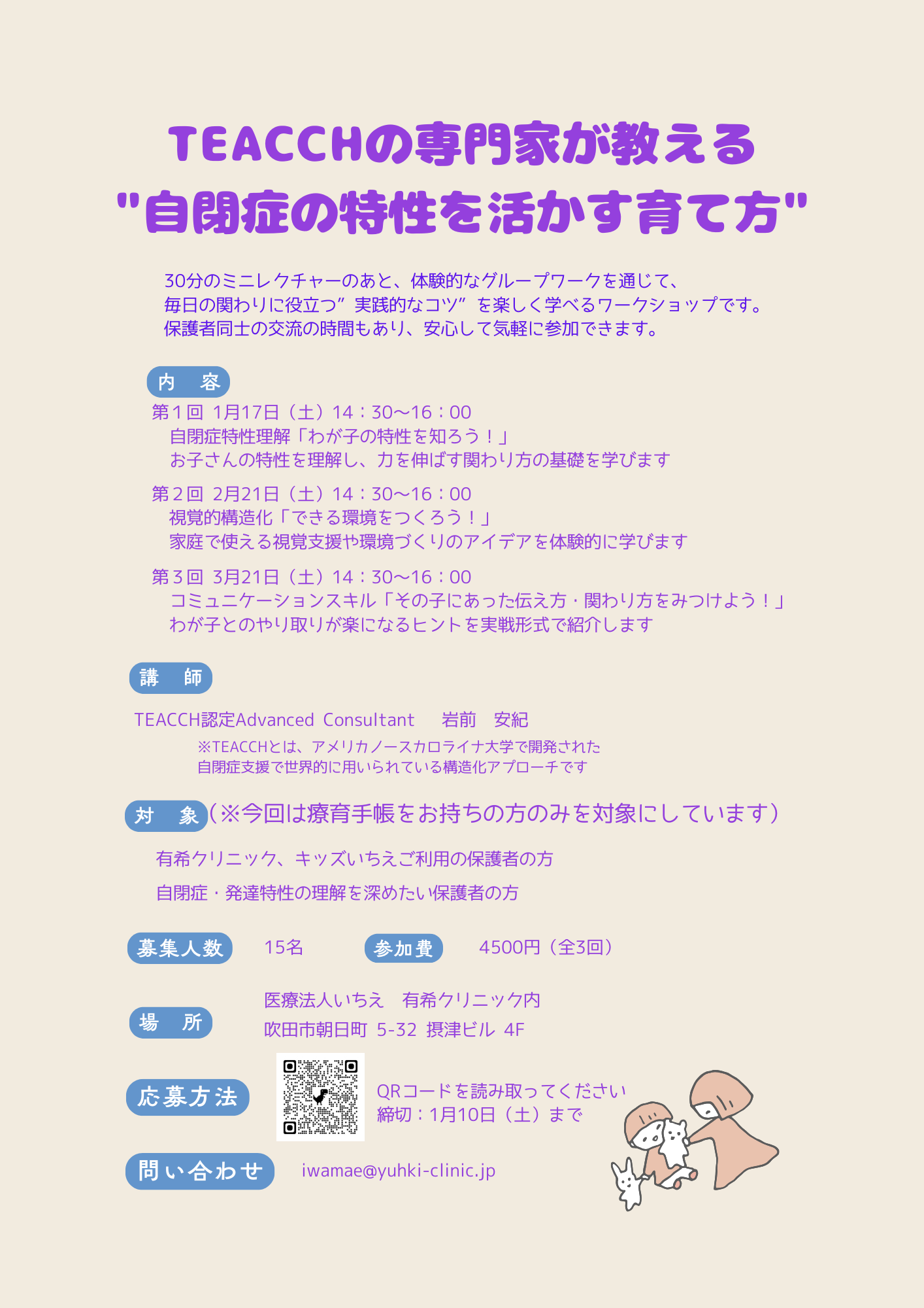 TEACCH認定Advanced Consultantである岩前安紀が保護者向け研修会を実施します。